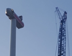 Der stetige Wind, der uns später im laufenden Betrieb des Windparks sehr freuen wird, erfordert andererseits in der Errichtungsphase der WEA01 viel Geduld bis das Heben der Großkomponten letztendlich fortgesetzt werden kann: Innerhalb eines Tages werden die restlichen Turmsegmente, das Maschinenhaus, der Triebstrang und die Nabe gehoben. Der nächste windärmere Tag ist für den Hub der Rotorblätter reserviert.