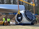 Das Maschinenhaus und die Nabe trafen auf der Baustelle ein. Neben dem Abladen dieser WEA-Großkomponenten erfolgte am Montageplatz der Zusammenbau der beiden unteren Turmabschnitte, die aus jeweils drei Einzelschalen bestehen. Der Hub dieser beiden, nun fertigen Turmsektionen, wird in der kommenden Woche erfolgen und danach die Anlieferung der drei weiteren Turmsektionen erwartet.