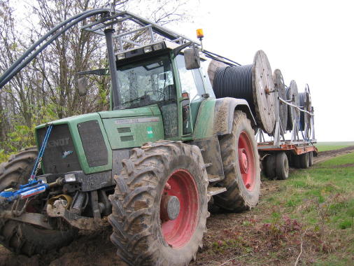 Die Kabelstränge befinden sich auf riesigen Kabeltrommeln, welche von einem Traktor nachgezogen werden.