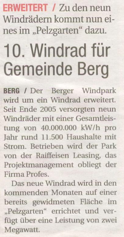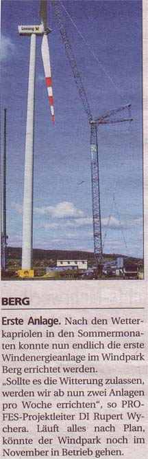 Nach Abschluss diverser Behördenverfahren liegen nun alle Genehmigungen zur Errichtung einer zusätzlichen WEA der Type Vestas V90 2MW im Windpark Berg vor. Die Errichtung wird aktuell durch das Fehlen eines geeigneten Ökostromgesetzes leider verhindert - von politischer Seite muss endlich gehandelt werden!