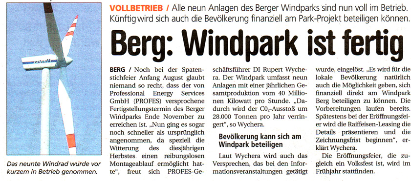 Der milde Herbst hat es ermöglicht, dass alle 9 Windenergieanlagen in Berg bereits ab Mitte November sauberen Strom ins Netz einspeisen können. Damit kann die jährliche Stromproduktion von voraussichtlich 40.000.000 kWh rechtzeitig vor dem Winter beginnen.