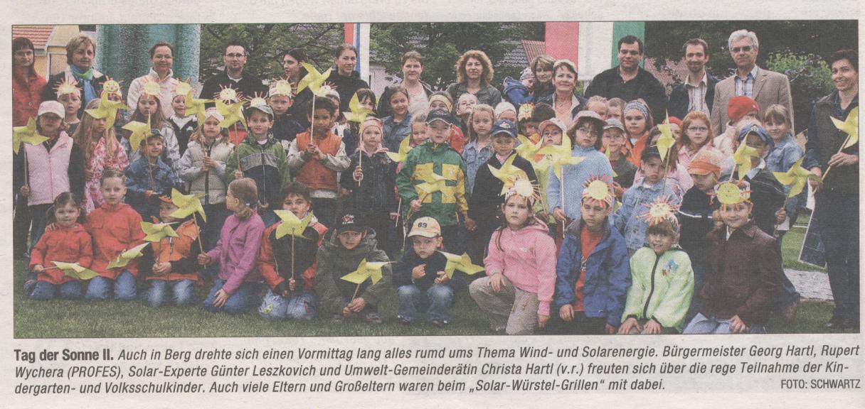 In der Klimabündnisgemeinde Berg drehte sich Anfang Mai am "Tag der Sonne" alles rund um das Thema Wind- und Solarenergie. PROFES stand den Besuchern für Fragen über Sonnen- und Windkraft zur Verfügung. Besonders erfreulich war die rege Teilnahme der Kindergarten- und Volksschulkinder, gemeinsam mit Eltern und Großeltern.