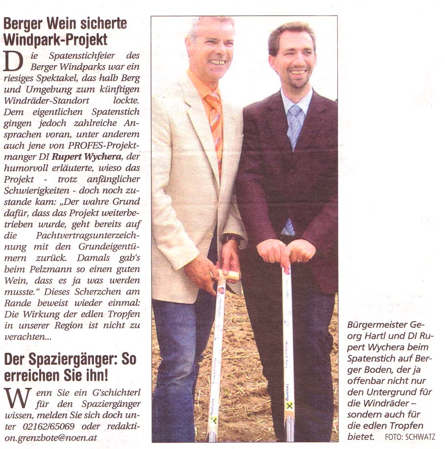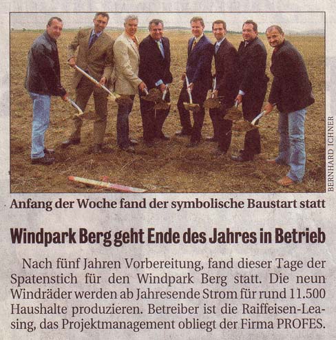 Bei starkem Wind, Sonnenschein und einigen Regenschauern wurde als Symbol für den Beginn der Errichtung des WP Berg der offizielle Spatenstich durchgeführt. Nach den Festreden von Bgm. Hartl, DI. Wychera und GF Mag. Engert von Raiffeisen-Leasing feierten die über 100 anwesenden Gäste bei Speis und Trank den Startschuss für ihren Windpark.