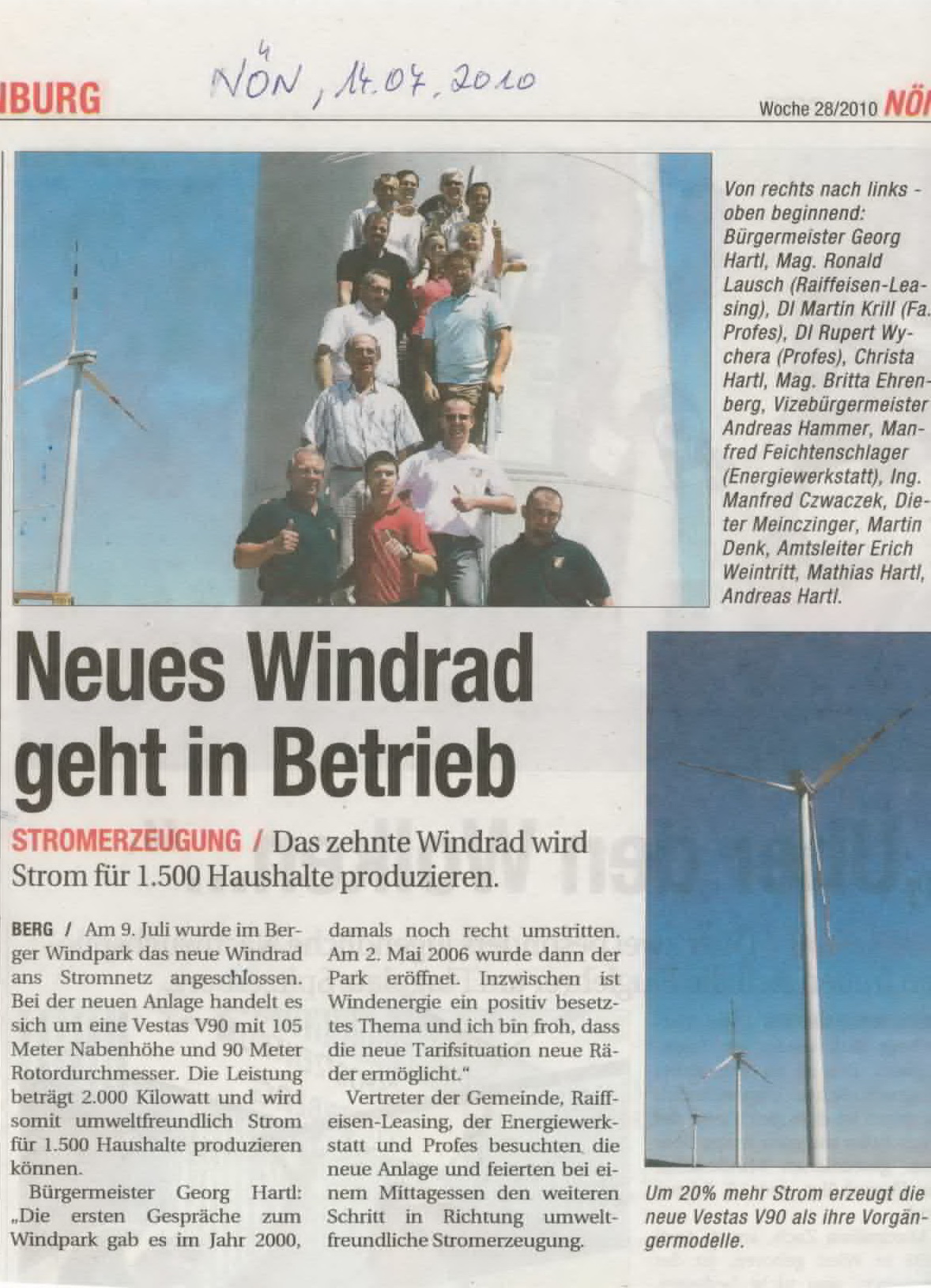 9. Juli dabei, als die neue WEA, eine Vestas V90 mit einer Leistung von 2.000 kW, ans Stromnetz angeschlossen wurde. Somit kann der Windpark Berg umweltfreundlichen Strom für zusätzlich weitere 1.500 Haushalte produzieren.