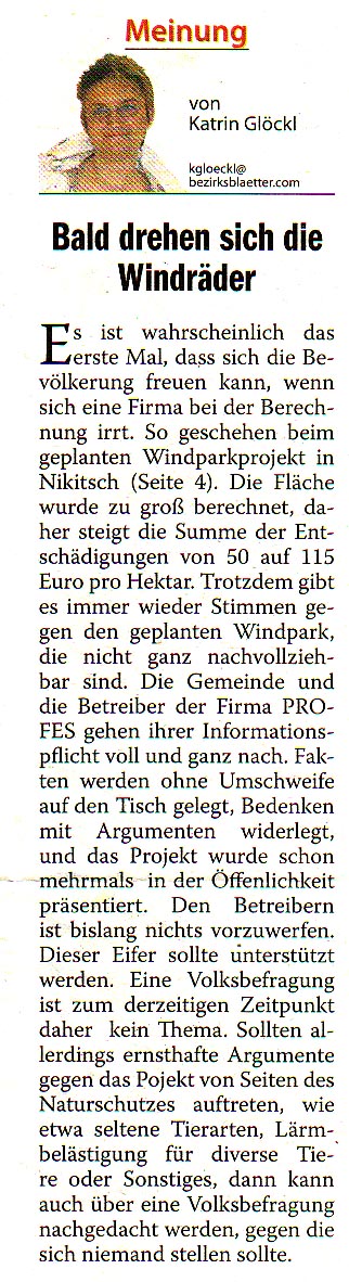 Heute am Abend wurde eine Grundsatzvereinbarung zwischen dem Projektbetreiber Raiffeisen-Leasing und der Gemeinde über die Entwicklung eines Windparks in Nikitsch unterzeichnet - für PROFES als Projektentwickler der erste Windpark im Burgenland. Dieser Grundsatzvereinbarung werden nun Informationsveranstaltungen der Bevölkerung und die weitere Projektentwicklung folgen, so zum Beispiel die Errichtung einer Windmessung.