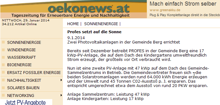 Seit Dezember betreibt PROFES in der Gemeinde Berg eine 17 kWp-PV-Anlage, die auf dem Dach des Kindergartens umweltfreundlich Strom erzeugt. Schon im Jänner wird eine zweiten PV-Anlage mit 47 kWp auf dem Dach des Gemeinde-Sammelzentrums in Betrieb gehen.