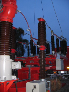 Hier erkennt man gut, wie die Leitungen des Umspannwerkes mit der 110 kV Leitung verbunden sind.