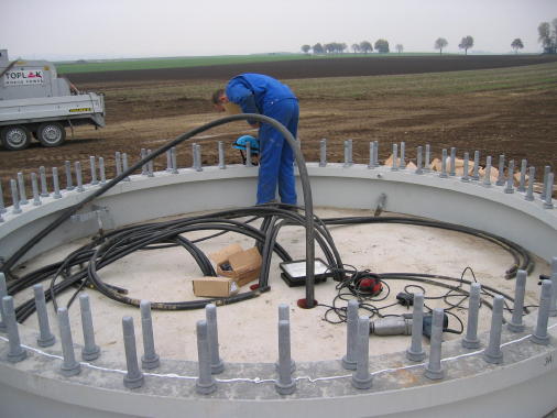 Die Verkabelung und die Bolzen für die Befestigung des ersten Turmsegmentes warten schon auf Ihren Einsatz.