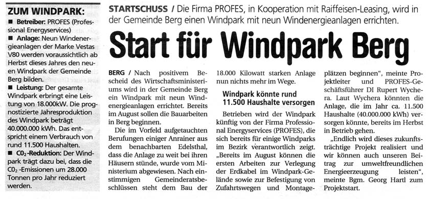 Heute erlangte der nach umfangreichen ornithologischen Untersuchungen im Dezember positiv ausgestellte Naturschutzbescheid Rechtsgültigkeit. Somit ist die Errichtung des Windparks für Sommer 2005 geplant.