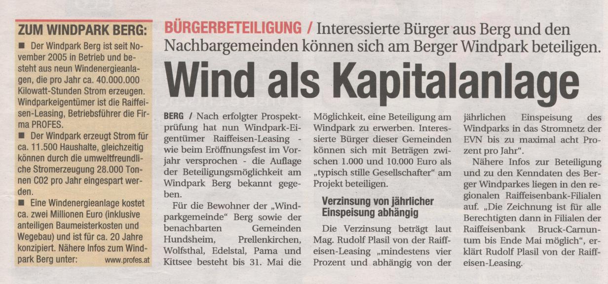 Im Mai 2007 bestand für interessierte Bewohner der Gemeinden Berg, Hundsheim, Prellenkirchen, Wolfsthal, Edelstal, Pama und Kittsee die Möglichkeit, sich mit Beträgen zwischen 1.000 Euro und 10.000 Euro als "typisch stille Gesellschafter" am Windparkprojekt zu beteiligen. Wir freuen uns, dass dieses Angebot angenommen wurde.