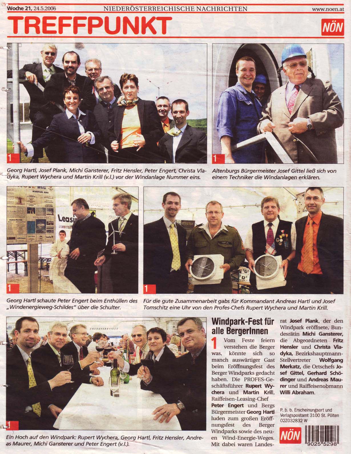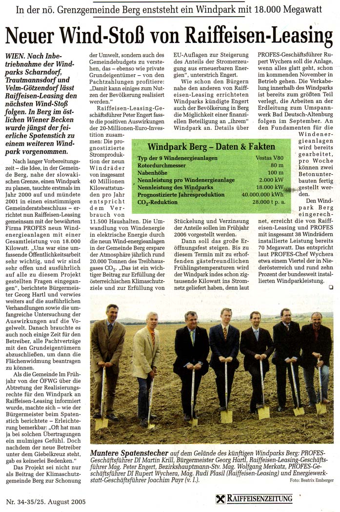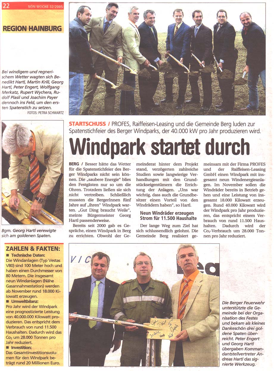 Bei starkem Wind, Sonnenschein und einigen Regenschauern wurde als Symbol für den Beginn der Errichtung des WP Berg der offizielle Spatenstich durchgeführt. Nach den Festreden von Bgm. Hartl, DI. Wychera und GF Mag. Engert von Raiffeisen-Leasing feierten die über 100 anwesenden Gäste bei Speis und Trank den Startschuss für ihren Windpark.