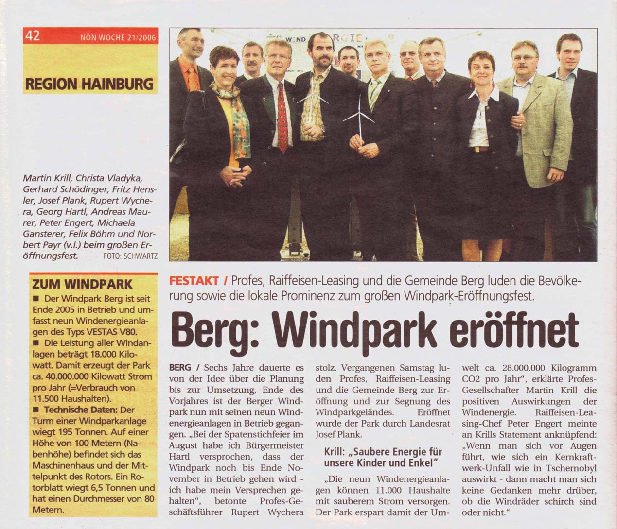 9. Juli dabei, als die neue WEA, eine Vestas V90 mit einer Leistung von 2.000 kW, ans Stromnetz angeschlossen wurde. Somit kann der Windpark Berg umweltfreundlichen Strom für zusätzlich weitere 1.500 Haushalte produzieren.