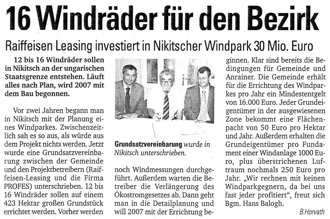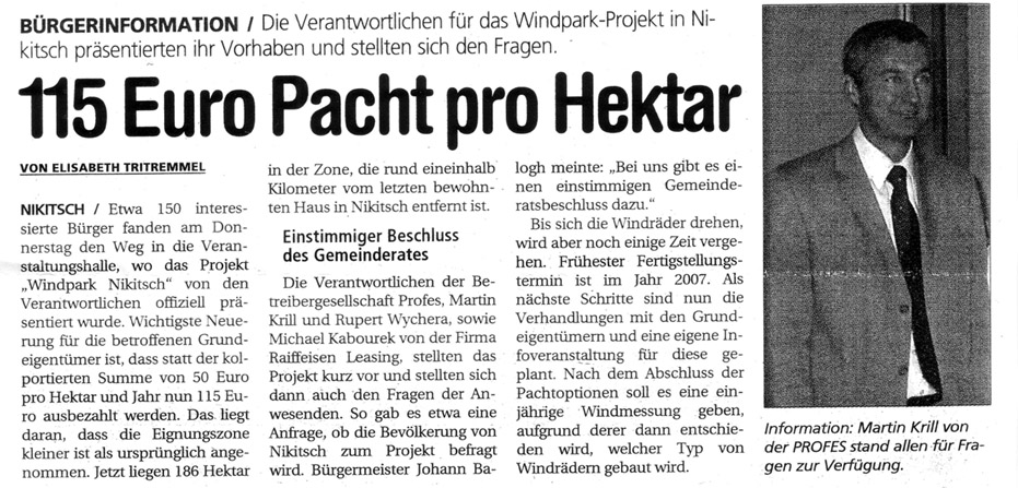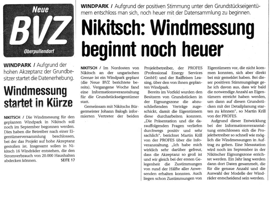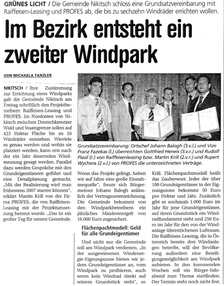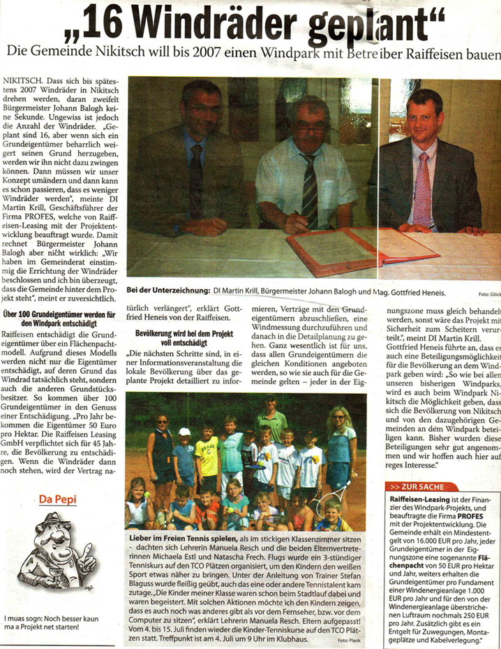 Heute am Abend wurde eine Grundsatzvereinbarung zwischen dem Projektbetreiber Raiffeisen-Leasing und der Gemeinde über die Entwicklung eines Windparks in Nikitsch unterzeichnet - für PROFES als Projektentwickler der erste Windpark im Burgenland. Dieser Grundsatzvereinbarung werden nun Informationsveranstaltungen der Bevölkerung und die weitere Projektentwicklung folgen, so zum Beispiel die Errichtung einer Windmessung.
